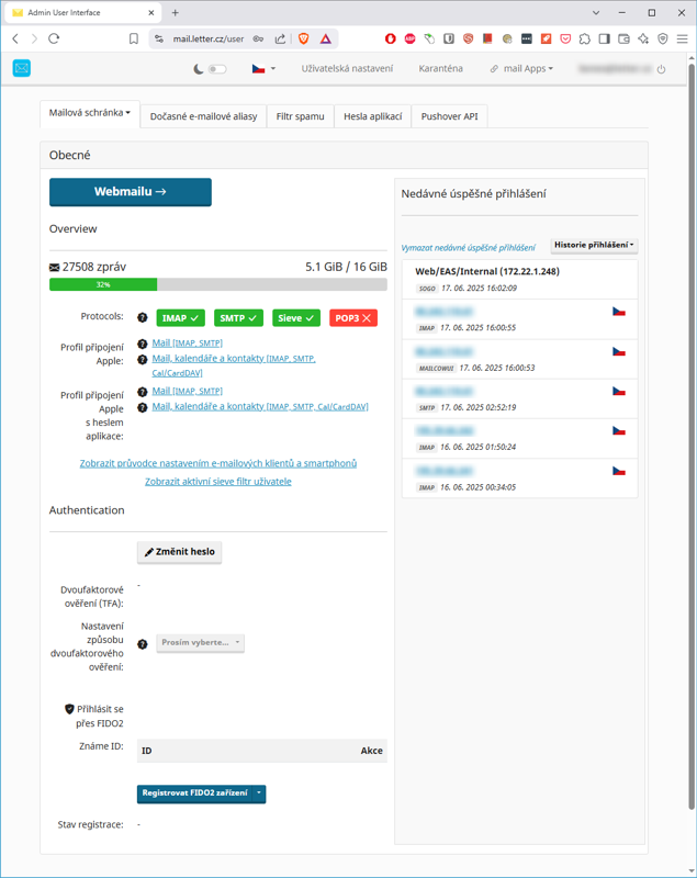 (položka 6) je cestou pro systémová nastavení. Obsahuje volbu pro změnu uživatelského hesla, registraci pro dvoufaktorové zabezpečení, ověření prostředky FIDO2 (Fast IDentity Online 2), nebo výčet nedávných korektních přihlášení. Další systémová nastavení jsou zpřístupněna dle individuálního nastavení administrátorem.